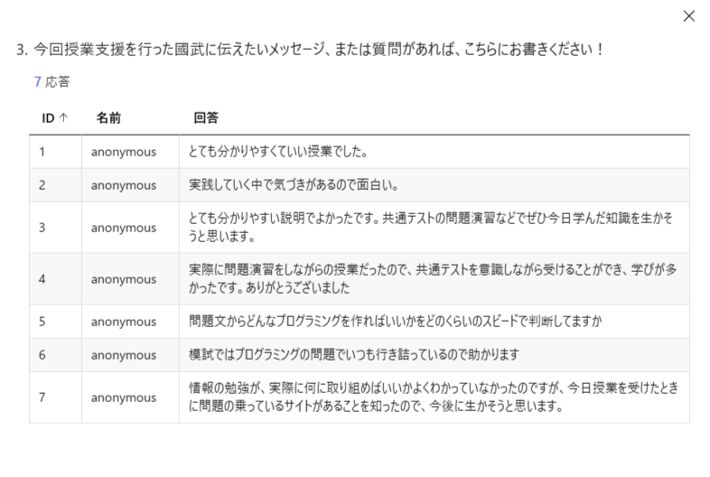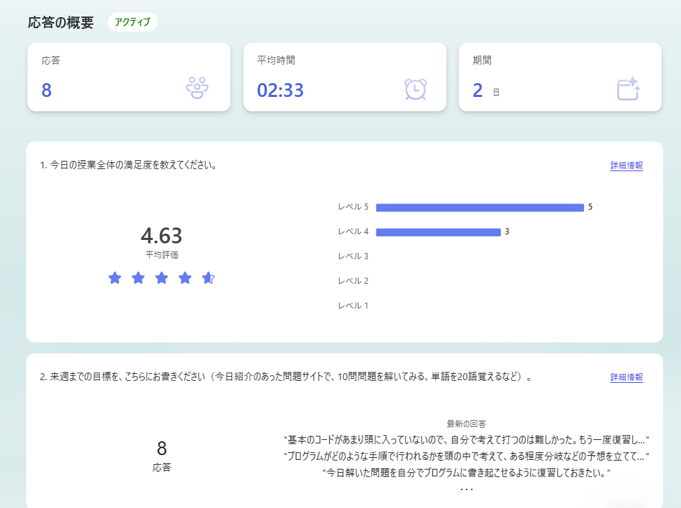 アンケートの総評としては、この時点だとまだ生徒の方々はコードを書く、理解するといった実技演習に不慣れであるものの、授業を通じて何を勉強すればよいのか分かったという前向きな進歩も見受けられました。