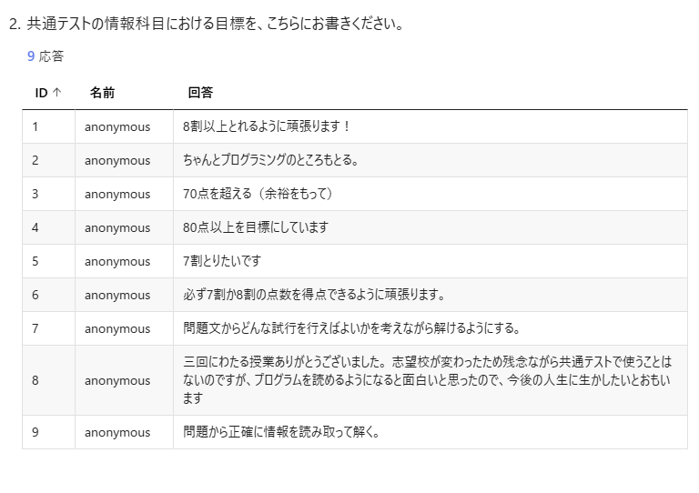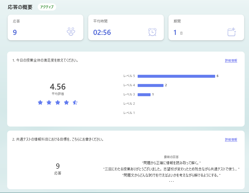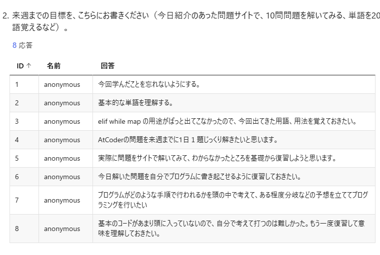 初回授業のアンケート結果は、以下の通りです。(初回は2名の生徒の方が、回答し忘れていたようです)