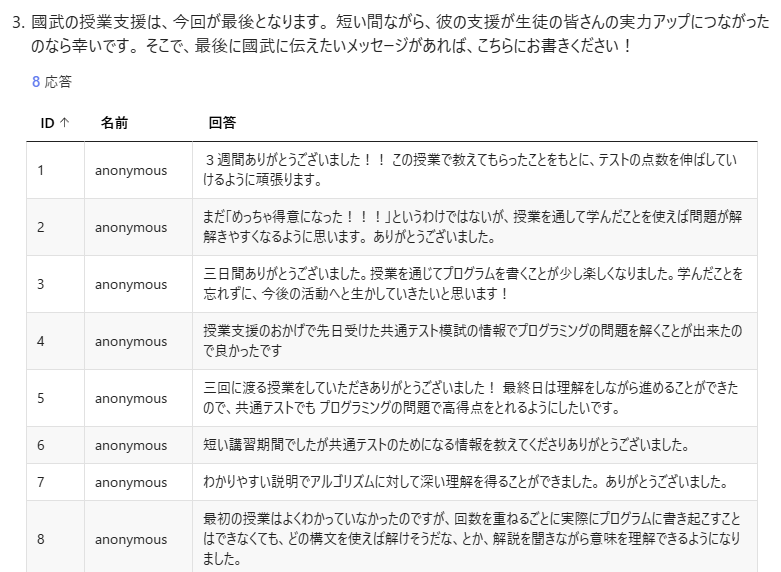 最終授業のアンケート結果は、以下の通りです。(最終回は、1名の生徒の方が回答し忘れていたようです)