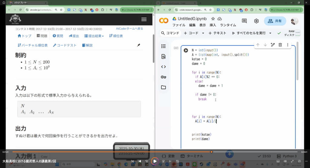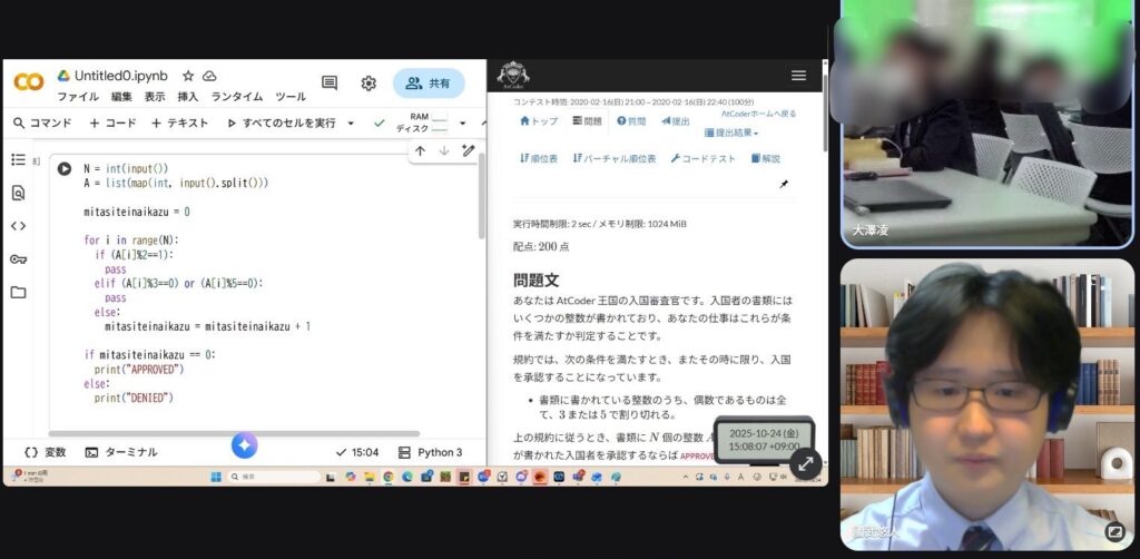 2回目と3回目の支援においては、國武のスケジュールの関係で、オンデマンド動画での支援となりました。幸い初回の授業については、アンケート結果からみて大きくついてこられない生徒の方はいなかったため、難易度はそのままで、引き続きAtCoderを活用した実技問題の対策を中心に行いました。