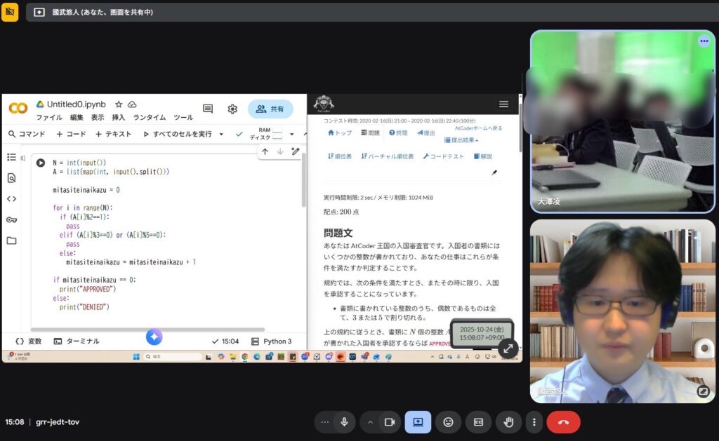 最終回の授業の際はAtCoderの問題演習に慣れてきたらしく、「問題文から使うべき構文の見当がつくようになった」「理解をしながら進められるようになった」というお声もいただくことが出来ました!。さらには嬉しいことに「授業支援のおかげで先日受けた共通テスト模試の情報でプログラミングの問題を解くことが出来た」 と、早速授業での成長が結果に表れ始めた生徒の方もいた様で、計270分しかない短い授業の中でも、生徒の方の力を伸ばす有意義な支援ができたのではないかと思います。